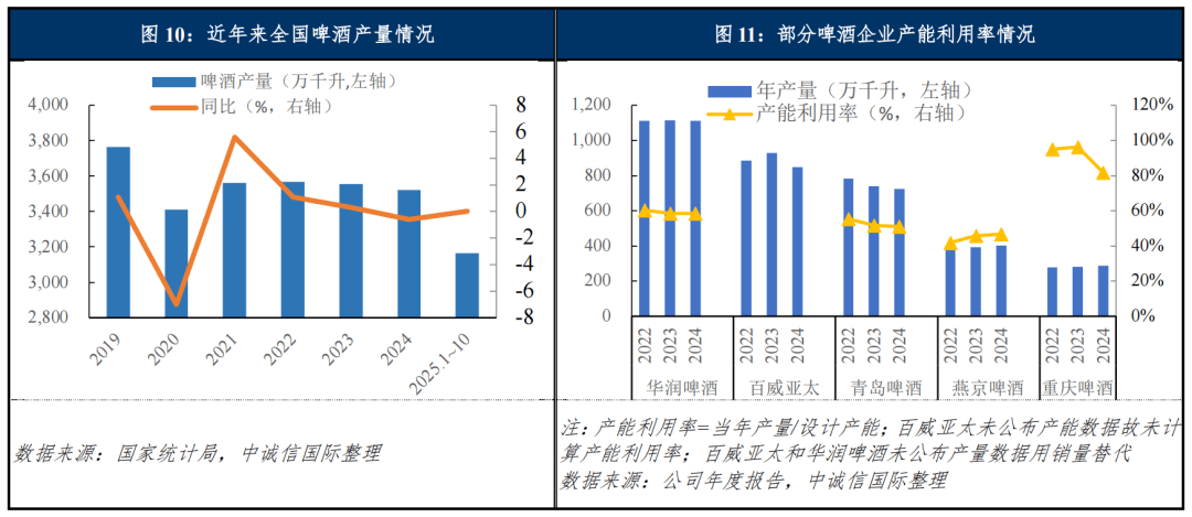 近年来我国啤酒产量规模变化不大,基本保持稳定,行业整体处于存量竞争市场。根据国家统计局数据,2025年1~10月我国规模以上啤酒企业产量3,163.1万千升,较上年同期持平。经过前期兼并重组的完成和落后产能的淘汰,我国啤酒行业已形成稳定的五强格局,分别是百威亚太、华润啤酒、青岛啤酒、重庆啤酒和燕京啤酒(以下简称“啤酒T5”),2024年啤酒T5企业的产量合计为3,372万千升3,占全部啤酒产量的95.8%,占比很高,市场格局呈现“强者恒强”的竞争态势。