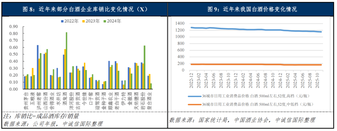 从销售方式来看,经销仍然是白酒行业的主要销售渠道。白酒生产企业凭借其强势市场地位,通常压货给经销商,实际销售压力主要集中在渠道。根据A股20家上市白酒企业数据,2025年前三季度白酒生产企业库存规模同比增长11.32%至1,706.86亿元,预收款规模同比下降1,一定程度上说明渠道消纳能力在弱化,以上市公司华致酒行连锁管理股份有限公司为例,作为酒类流通第一股,2025年前三季度实现营业收入51.64亿元,同比下降34.07%;归属于上市公司股东的净利润-1.99亿元,同比下降218.48%。因为库存积压,经销商为了完成酒厂任务和资金回笼,不得不选择薄利多销,部分经销商选择低价抛货,部分名酒和二三线品牌市场成交价低于经销价,出现价格倒挂现象。2025年年初, 2024年飞天茅台(500ml)原箱终端每瓶价格在2,300元左右,6月终端价格下行至1,900元每瓶,12月进一步下行到1,600~1,700元每瓶的价格,到2026年1月部分渠道终端每瓶价格已达到官方指导价1,499元。行业标杆的飞天茅台终端价格下行反映出2025年白酒消费尤其是高端白酒消费滑落压力,市场动销形式面临很大挑战。2026年需持续关注白酒行业库存去化情况,若库存压力超过了经销商承受极限,价格压力或直接传导至生产端,白酒企业的盈利能力或将承压。头部酒厂依托较好品牌优势和市场地位,通过将去化压力转嫁至经销商,仍能够保持一定的业绩增速,但终端白酒消费持续低迷,导致经销商资金回笼缓慢,未来白酒消费如持续低迷,经销商资金压力增加将导致其消纳白酒厂商库存能力减弱,最终将导致白酒企业业绩下滑。