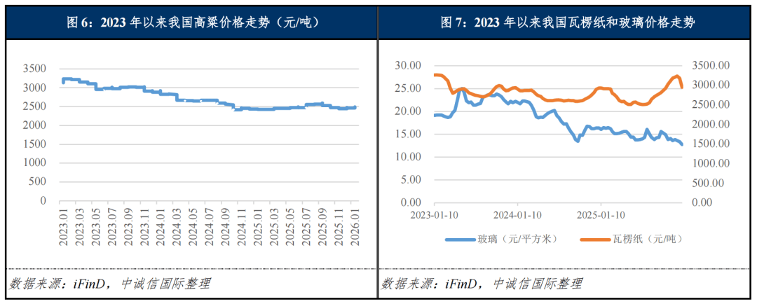 白酒的成本包括直接原料成本和人工成本,其中直接原料成本占营业成本的比例约为50%~90%。直接原料包括酿酒原材料和包装材料等,其中酿酒原材料主要为谷物,高粱占主导地位,其次为大米、小麦、糯米、玉米、大麦、青稞等,占直接原料采购成本的比例约为20%~50%,上述原材料价格受国家宏观经济、国际贸易往来、市场供需、自然气候、地理环境、产量等因素综合影响;包装材料主要为玻璃瓶和纸,我国包装印刷类厂商众多,白酒生产企业拥有较大的选择空间,具有一定的议价能力。2024年以来高粱为主的原材料价格总体呈下降态势,用于白酒包装的瓦楞纸和玻璃等原材料价格走势有所分化,但白酒企业生产成本占营业收入的比重相对较小,原材料价格变化对其影响有限,白酒行业平均毛利率维持在较高水平。