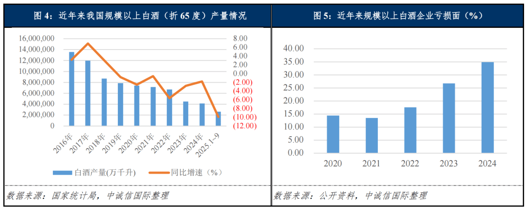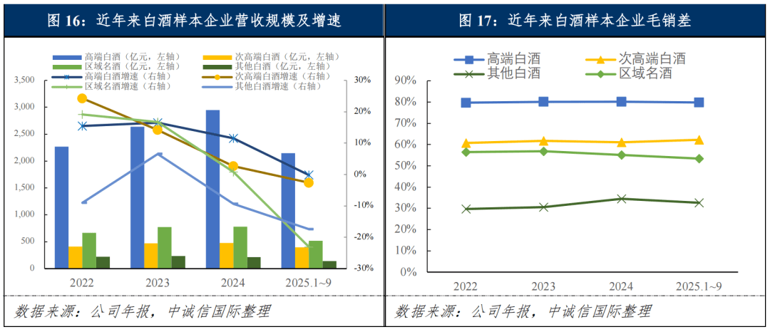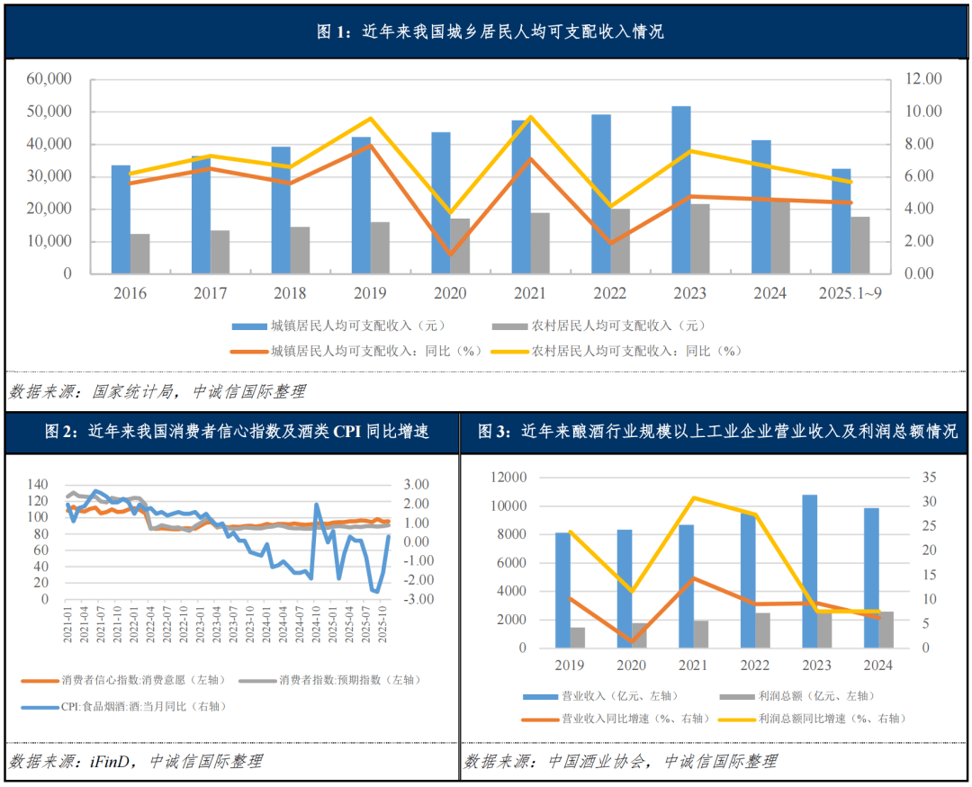 2025年前三季度,我国GDP和居民人均可支配收入(扣除价格因素)增速均为5.20%,在经济弱复苏及消费信心不足的背景下,2025年1~11月,酒、饮料和精制茶制造业规模以上企业收入同比下降3.0%,利润总额同比下降5.2%,呈现收入利润双降局面。近年来居民健康意识的提高和理性消费观念的深入,对传统酒类产品的需求也产生一定冲击,酒类CPI自2023年四季度开始持续为负,2024年四季度有所反弹,但整体仍处弱势。此外,2025年全国房地产开发投资同比下降17.2%。为应对经济疲软,2025年以来,中央以“提高赤字率+扩大债券规模+定向补贴”为核心,撬动社会消费与经济增长,相关政策的出台将有利于中国经济修复斜率回升。但同时我们也关注到,2025年5月,中央修订发布《党政机关厉行节约反对浪费条例》,明确要求国内公务接待工作餐不得提供任何酒类、香烟及高档菜肴。这一政策出台加重了市场对白酒商务消费的担忧,对中高端白酒市场产生较大负面冲击。