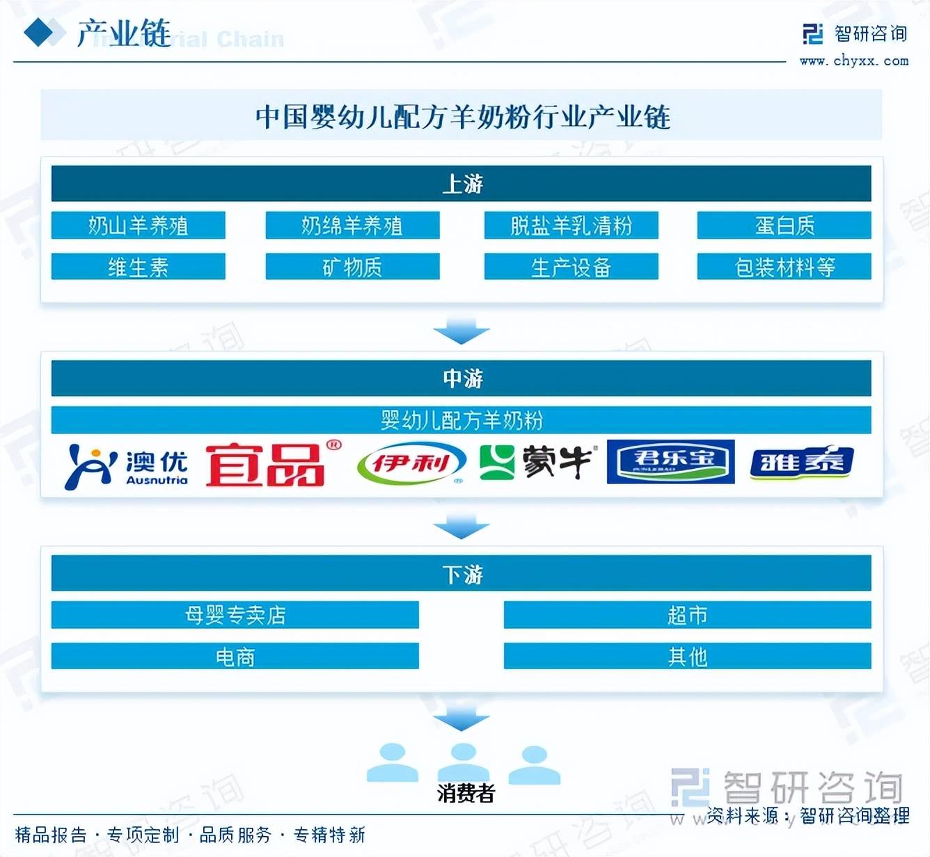 婴幼儿配方羊奶粉行业上游主要包括奶源(奶山羊养殖、奶绵羊养殖等)、辅料(脱盐羊乳清粉、蛋白质、维生素、矿物质等)、生产设备、包装材料等行业,其在,奶山羊养殖是婴幼儿配方羊奶粉产业链的源头,优质的奶源是保证羊奶粉质量和口感的关键,我国奶山羊养殖主要集中在陕西、山东、河南等地,如陕西的关中地区是著名的奶山羊养殖基地,拥有萨能奶山羊等优良品种,此外,部分企业通过自建牧场,实现了奶源的自给自足和安全可控,从源头保障奶源质量;行业中游为婴幼儿配方羊奶粉研发、生产等环节;行业下游主要包括母婴专卖店、超市、电商等线上线下销售渠道以及终端消费者。